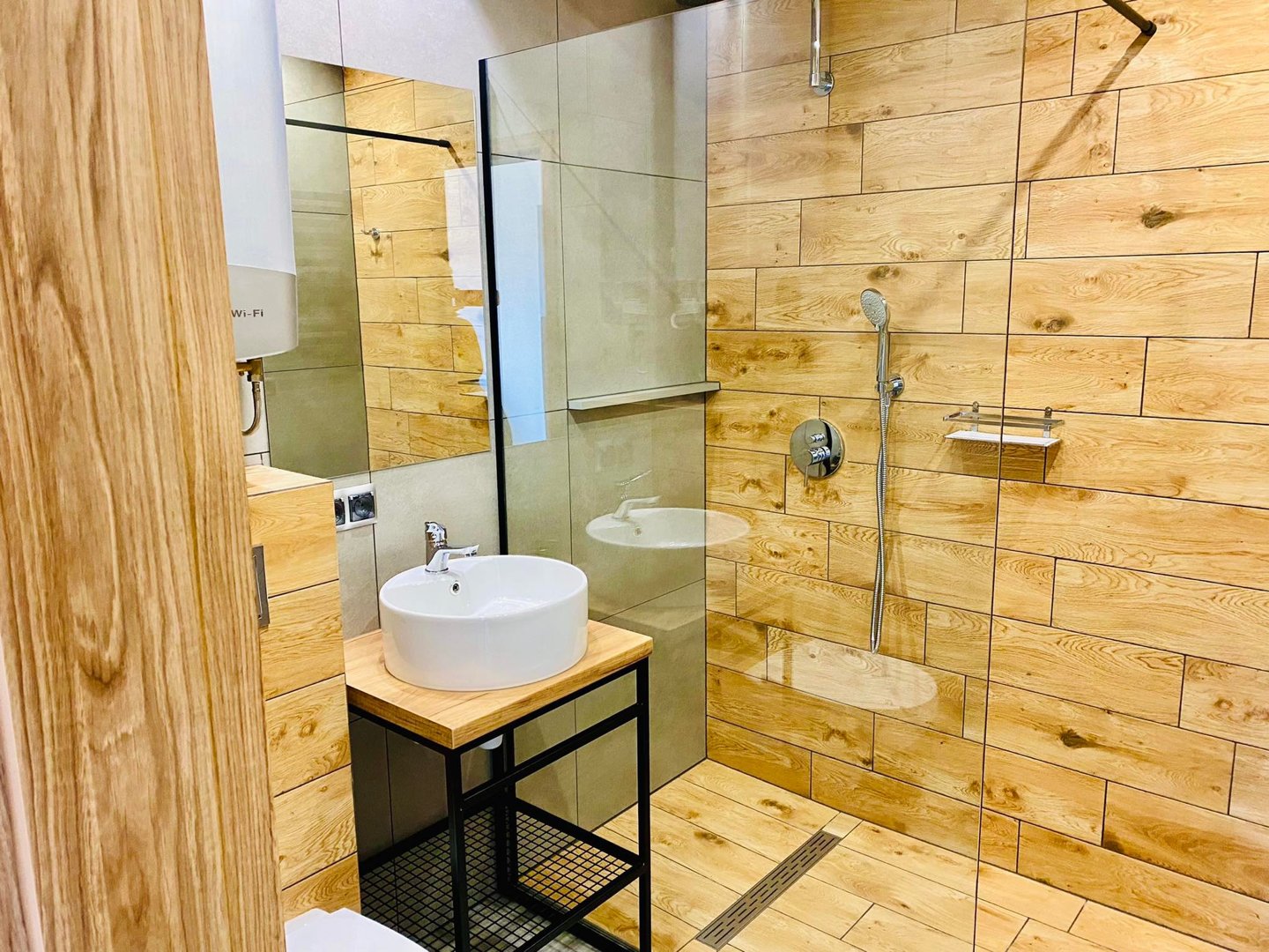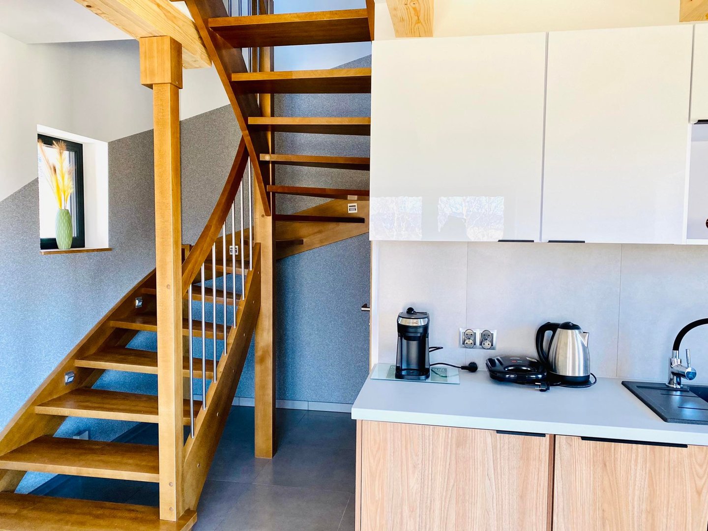 na parterze - obszerny salon z wyposażoną kuchnią oraz wygodną rozkładaną sofą 2-osobową i łazienką z prysznicem.